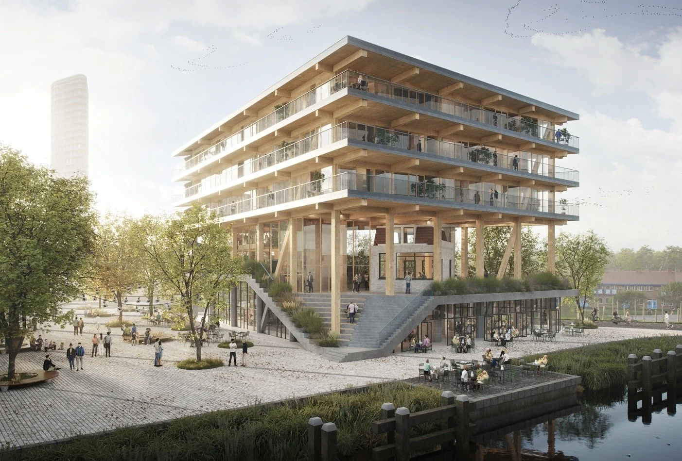 The CLT structure stands on a concrete base. The office floors are completely surrounded by balcony’s. They determine the appearance of the building, but also keep the sun out in the summer to keep the building cool, provide room for facade maintenance and they are a great place to have a beer on friday afternoon.