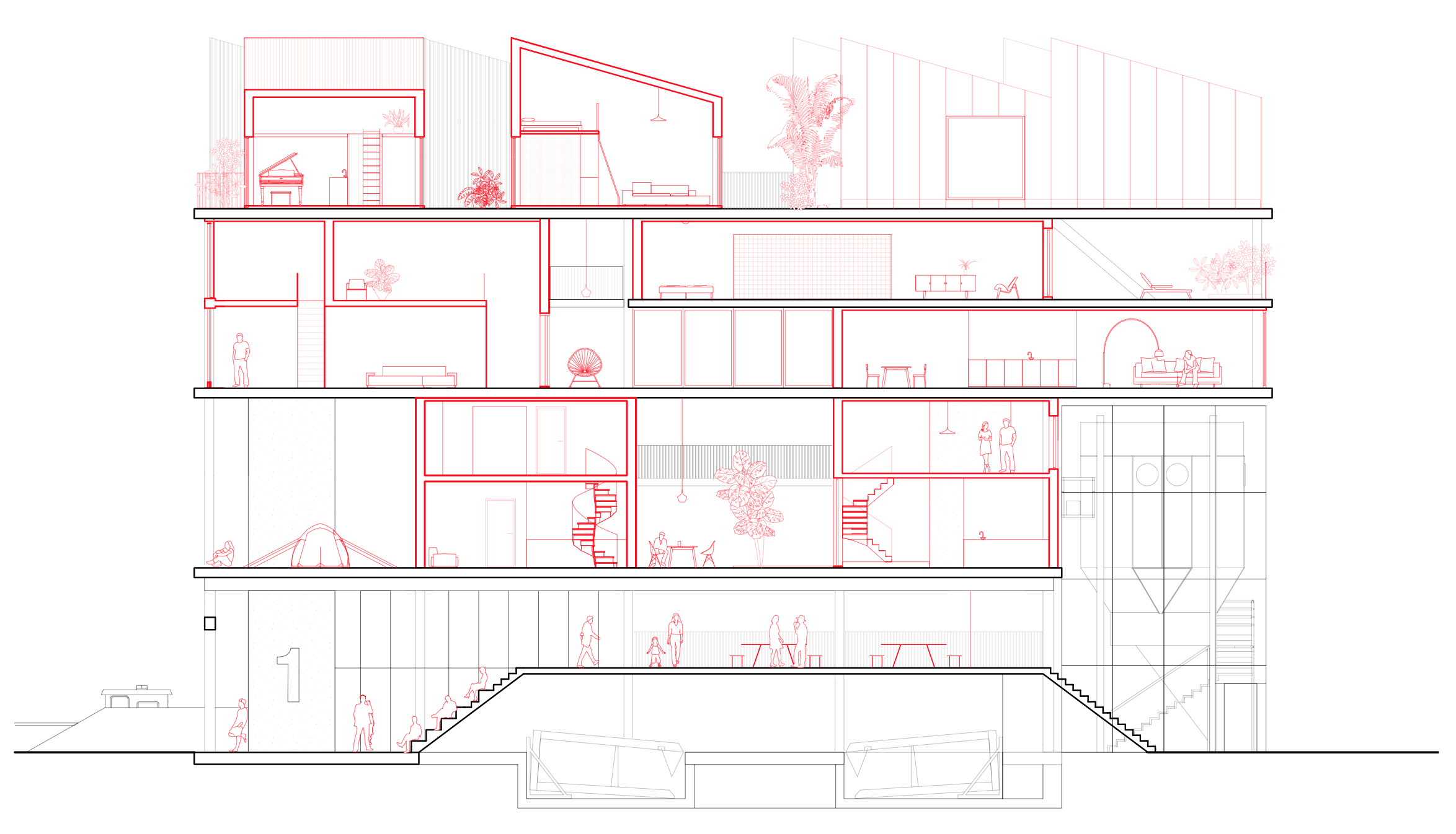 An extra complication were the integrated outdoor spaces. The floor and ceiling of the superstructure needs to be fully insulated but at the same time allowing for a smooth transition between indoor and outdoor.